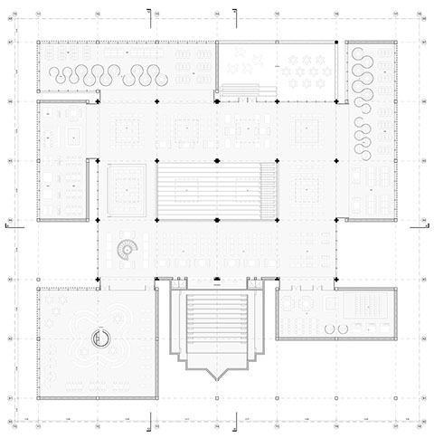 No part of the old structure is demolished; the existing building is completely reused and retrofitted. Some of its existing elements -like the auditorium- are updated to become the central elements of the library’s new image from the street. All parts of the building, both old and new are clad in the same type of local stone giving the building a unitary image. As the new additions wraps around the existing structure, the old building lives on as the heart of the new building.