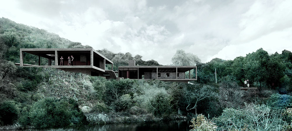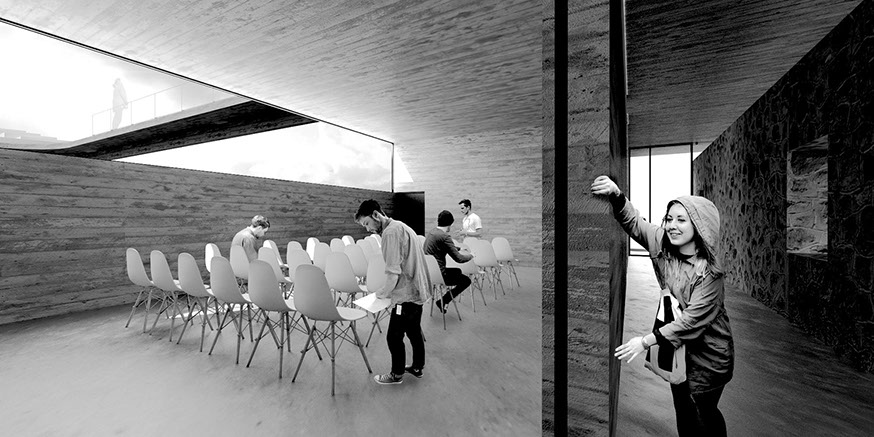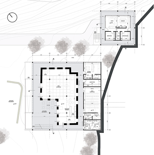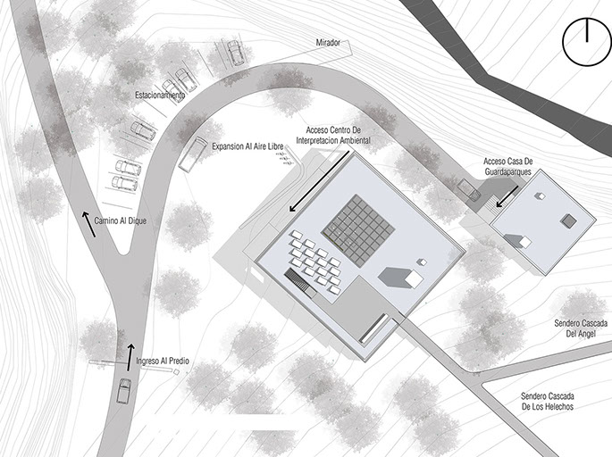 La propuesta reorganiza el sistema de movimiento del área que actualmente es poco legible y desordenado. En lugar de que los senderos rodeen a los edificios como sucede actualmente, el nuevo centro de interpretación funciona como un portal de ingreso y control de los recorridos de la reserva. De este modo, se genera una coreografía de movimientos que comienza en el arco de acceso al predio que lleva al claro dónde está ubicado el centro de interpretación y un pequeño mirador que se proyecta sobre la barran norte. Desde este claro se asciende por una rampa hasta el centro de interpretación donde el visitante se registra y accede al área de exposiciones.