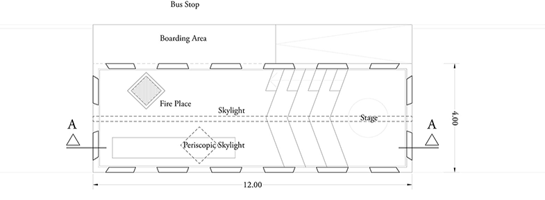 Neighbours spontaneously gather in bus stops. But bus stops are not designed for them to interact, rather they are socially awkward places. is projects pretends to create a welcoming space where neighbours with similar concerns and with time at their disposal can make spontaneous or arranged meetings to discuss their common problems. They can gather around a replace or in a small auditorium for up to 16 persons.